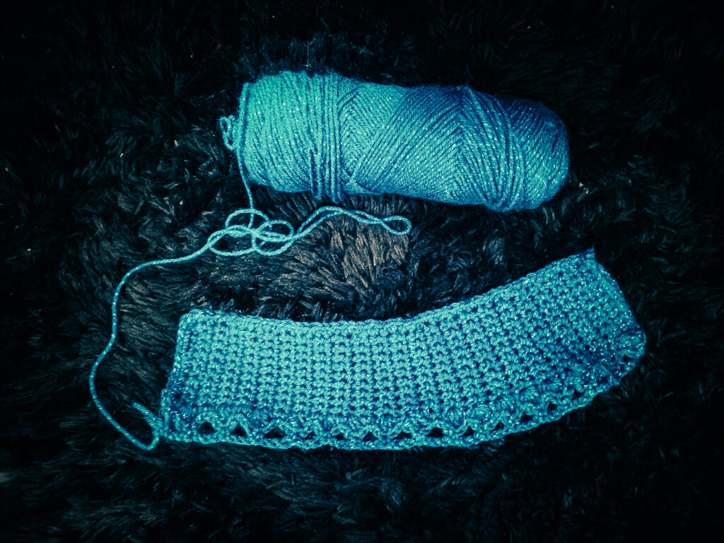 Today I started with a blue glitter yarn, where I crocheted a swatch in the past, and in the 10 minutes that we did, added 1 row of shells, and then went over into a net