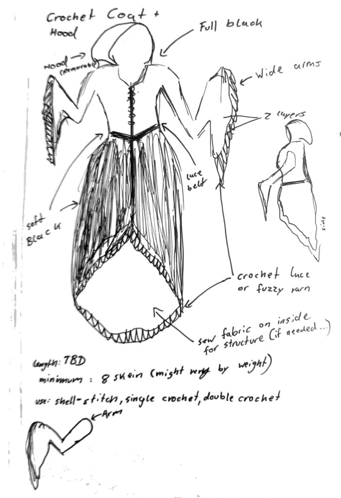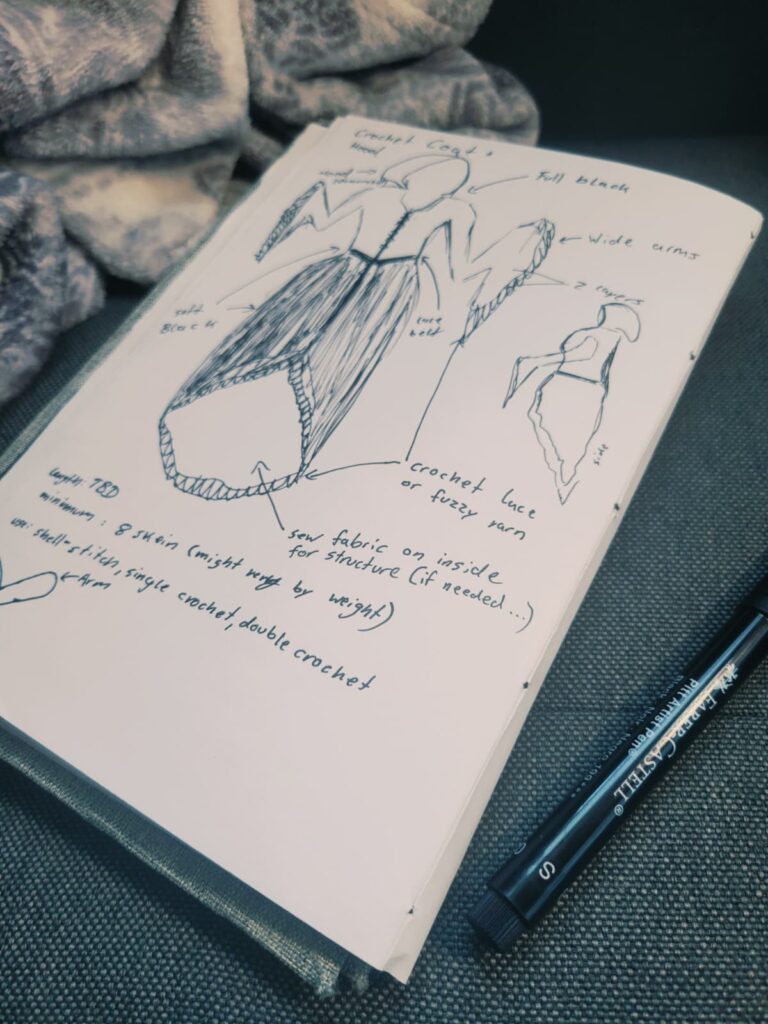 In this project, I will design and create a full black crochet coat using shell and netting stitches to explore texture and structure. I will develop multiple sketches, collect research images, and test yarn samples before beginning production. I will use Brushed Rainbow, Petite Purl, and Baby Soft Bamboo Cotton yarn in black tones to create visual depth. I will track my materials, budget, and time throughout the process. After organizing my sketches, research, color plan, materials list, and samples into a single published design proposal page, I will move into production and complete the coat according to my finalized plan.