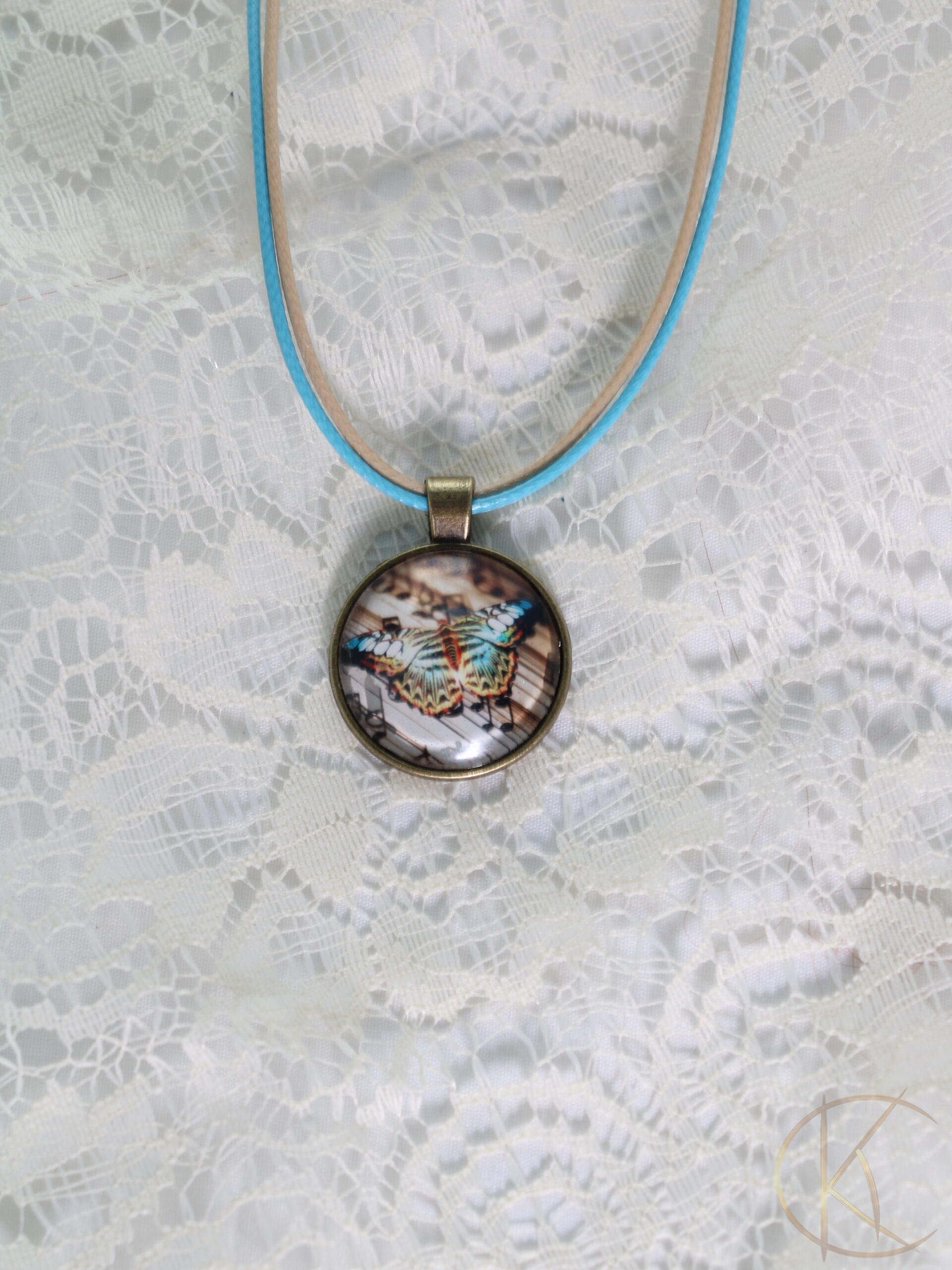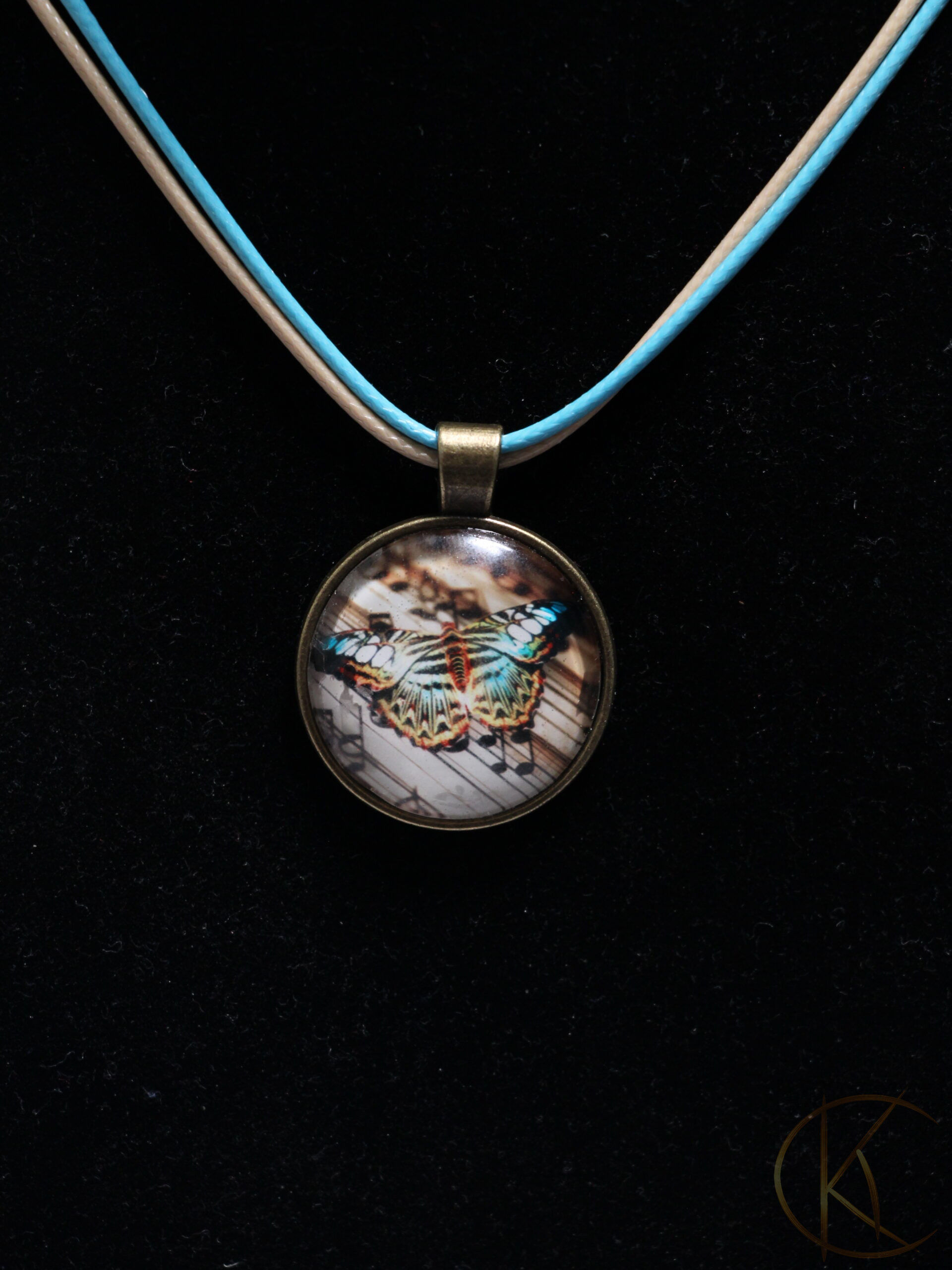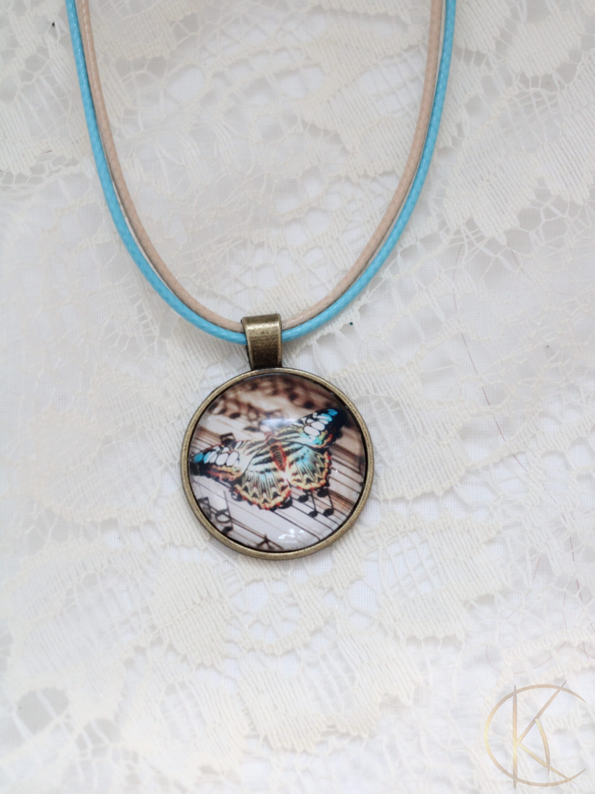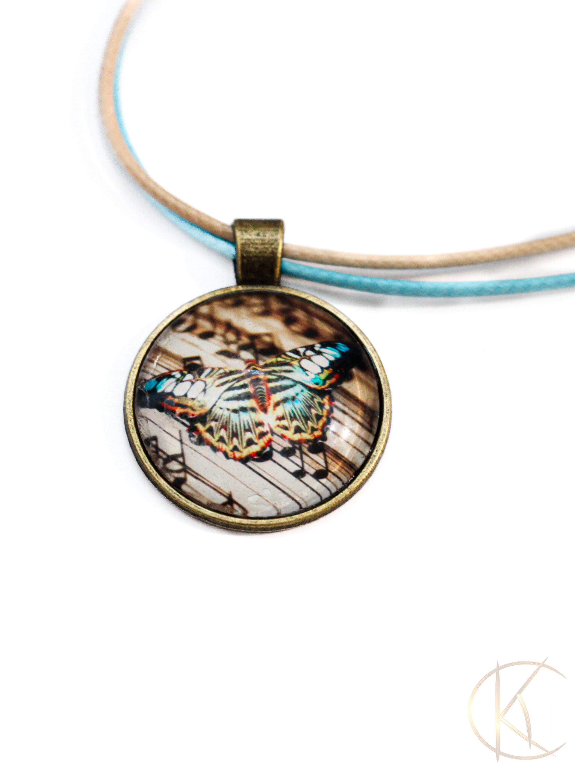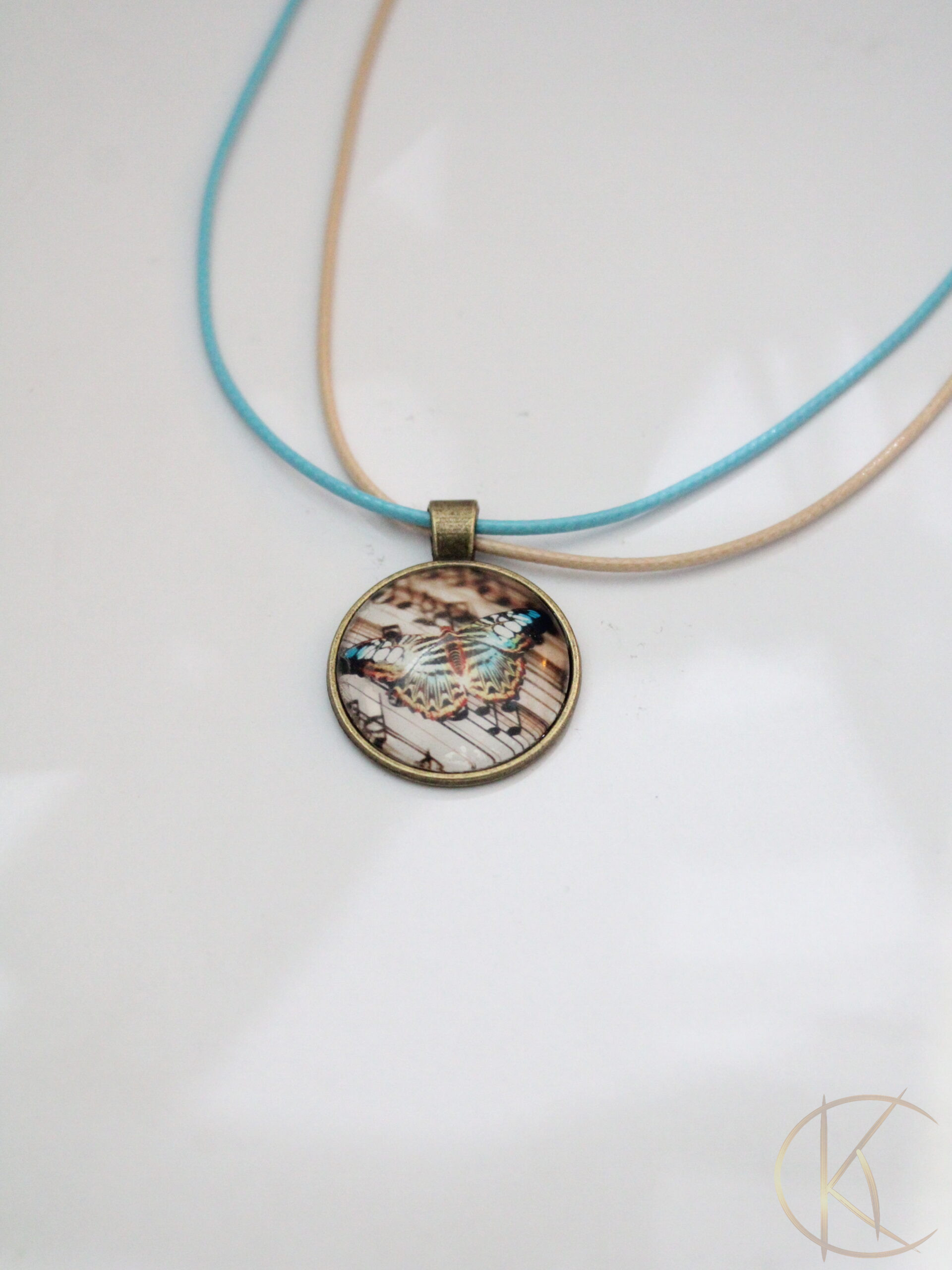 Unique Image pendant with Butterfly on music notes, in a round vintage-gold pendant tray, covered with Glass dome for a clear and bright image and doubled Cord Necklace (blue and beige)